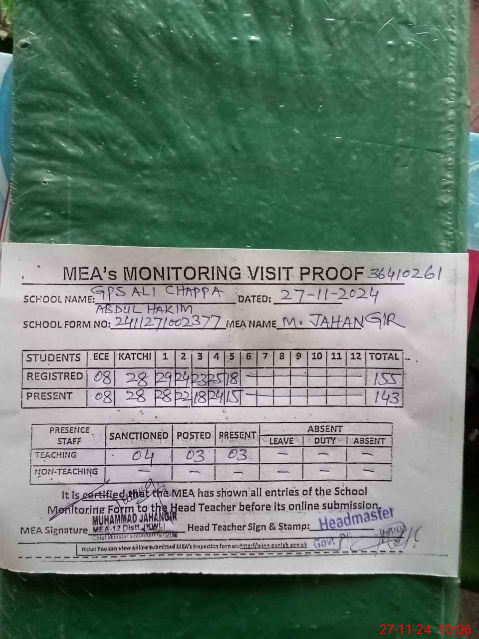 | EMIS Code: 36410261 | Name of School: GPS ALI CHAPPA, P/O 9-B/8-R, ABDUL HAKIM | |||