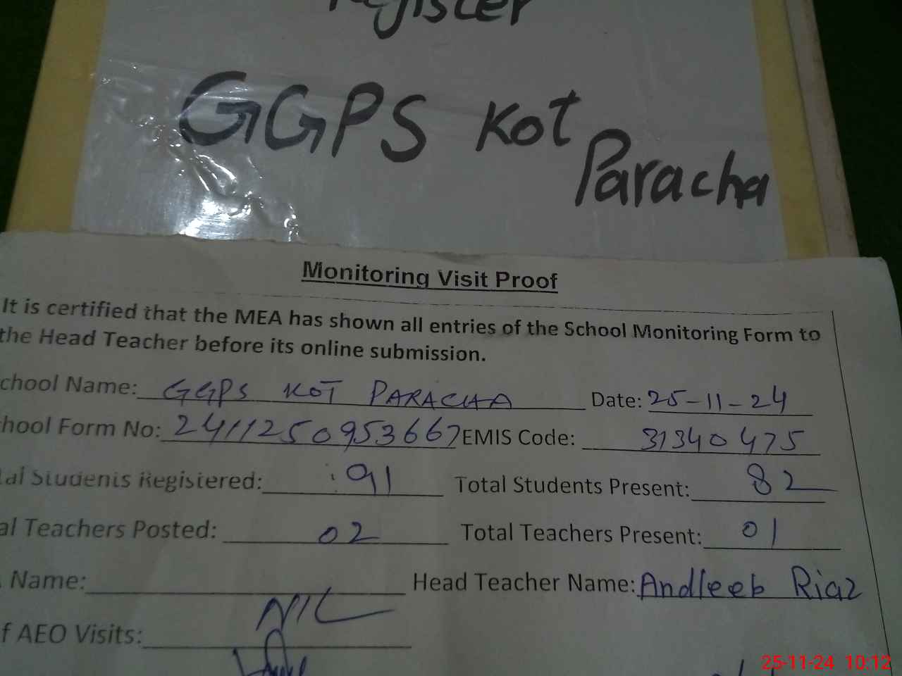 | Attendance Register | Head Teacher | MEA with School | Visit Proof |