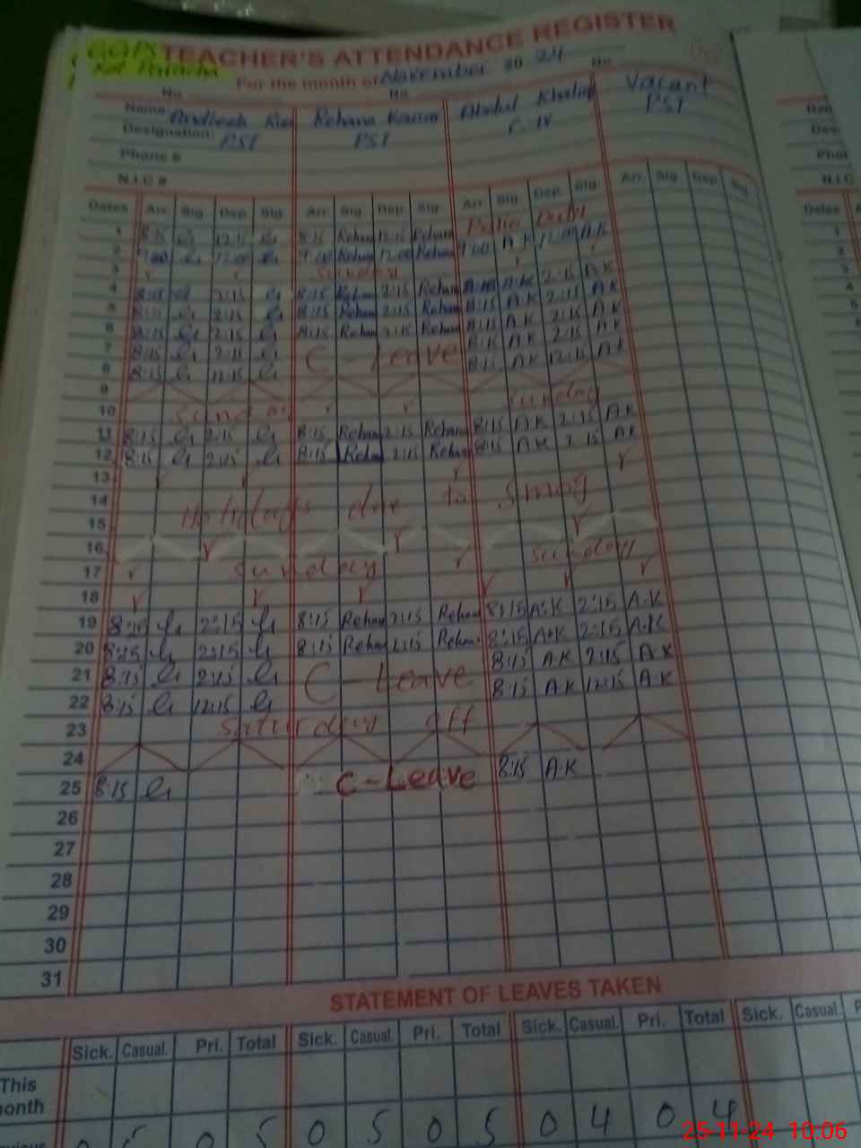 | Leave | Duty | Absent | Maternity | Medical | Ex- Pak |