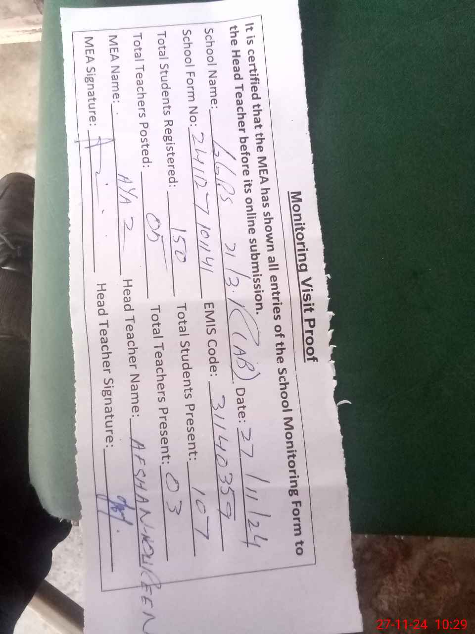 | Name: SH**** FA**** Designation: (School Headmaster's/Headmistress's) EST Phone/Cell Number: 03**** |