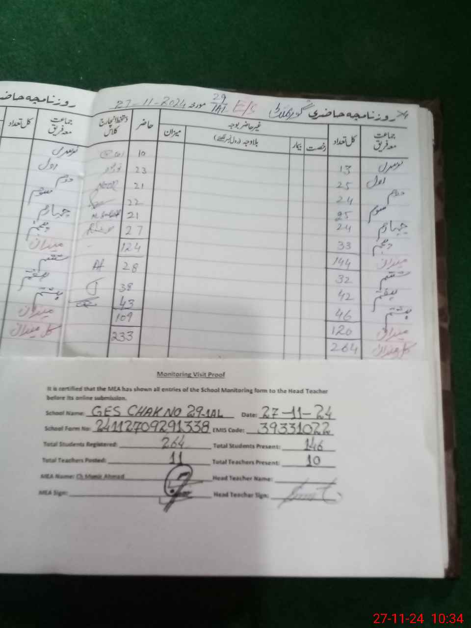 | Attendance Register | Head Teacher | MEA with School | Visit Proof |