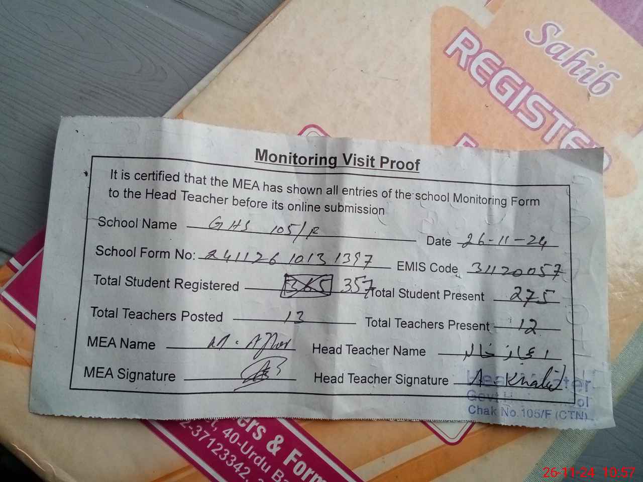 | EMIS Code: 31120057 | Name of School: GHS CHAK NO. 105/F | |||