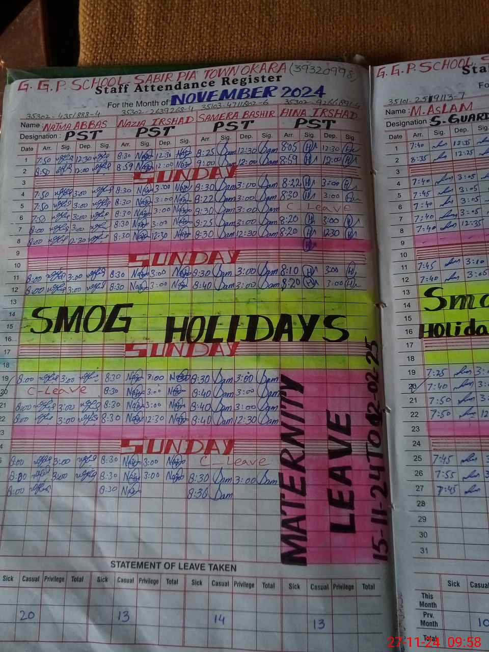 | Leave | Duty | Absent | Maternity | Medical | Ex- Pak |
