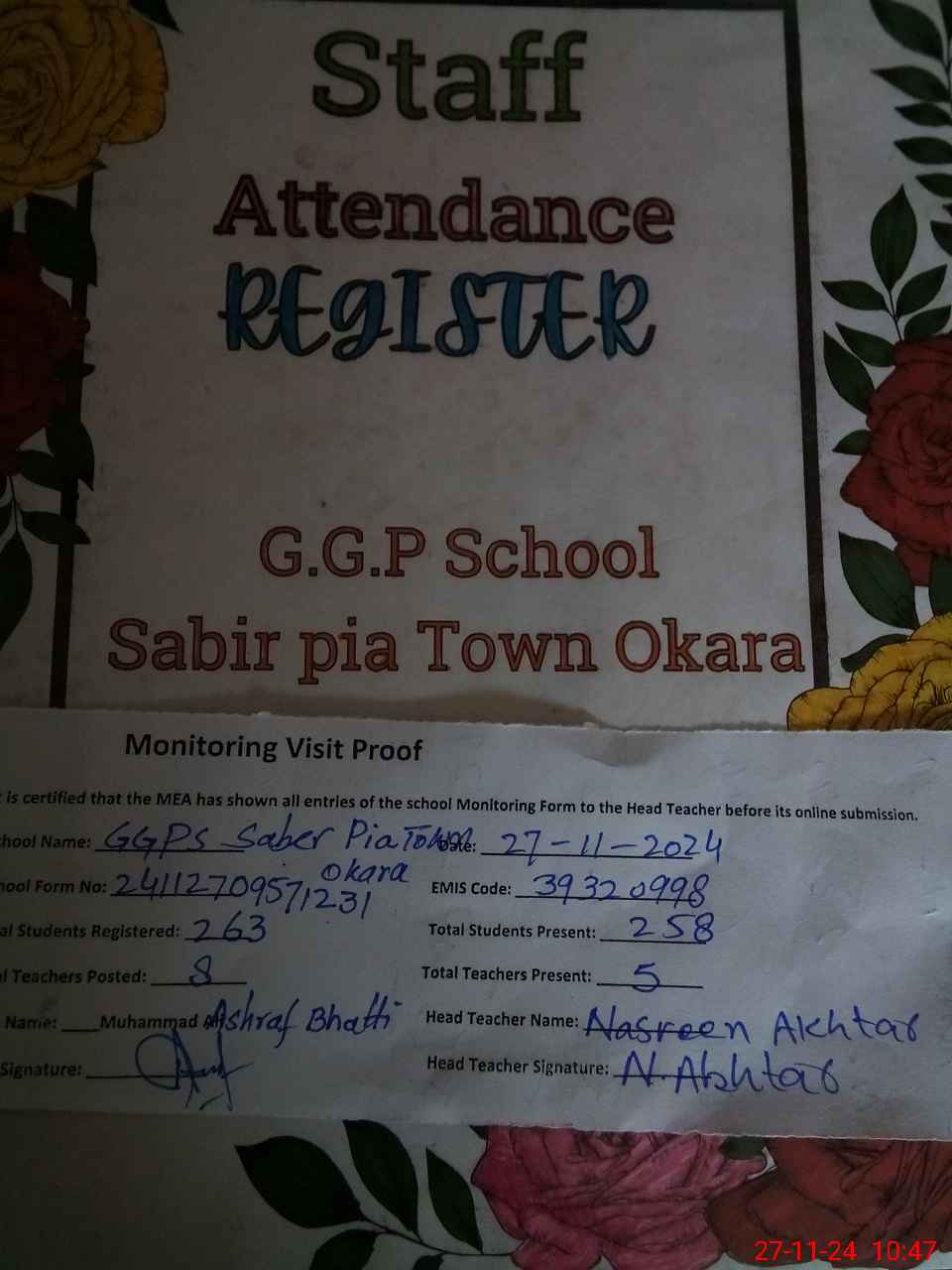 | EMIS Code: 39320998 | Name of School: GGPS SABIR PIA TOWN OKARA | |||