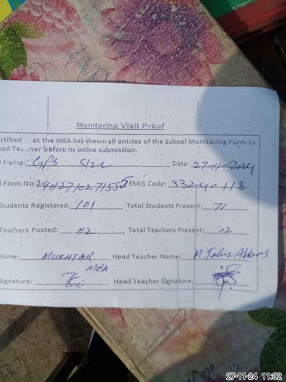 | Attendance Register | Head Teacher | MEA with School | Visit Proof |