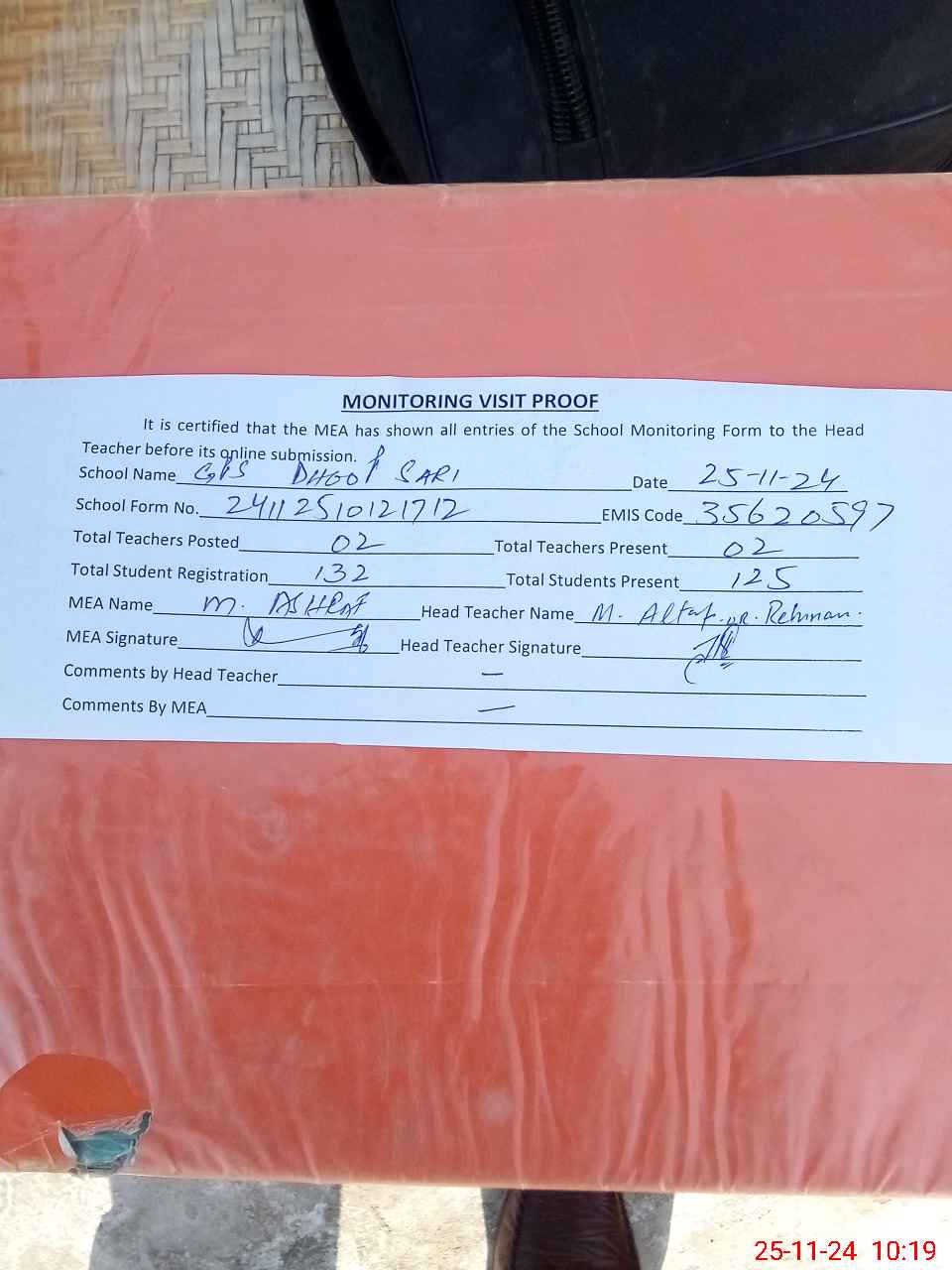 | Attendance Register | Head Teacher | MEA with School | Visit Proof |