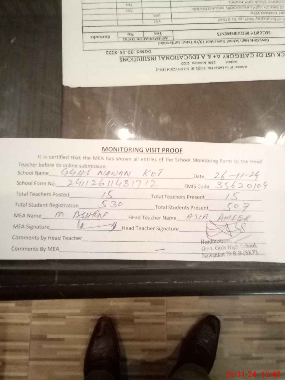 | Certified that this School was Inspected by the Undersigned MEA/DMO Today and the Information Stated Above is as Per Record. | |||||