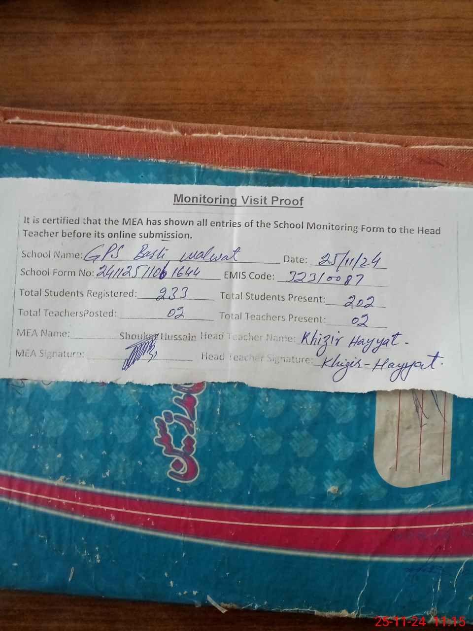 | Attendance Register | Head Teacher | MEA with School | Visit Proof |