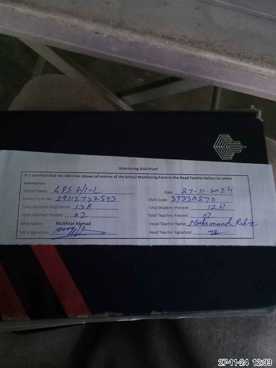 | Attendance Register | Head Teacher | MEA with School | Visit Proof |