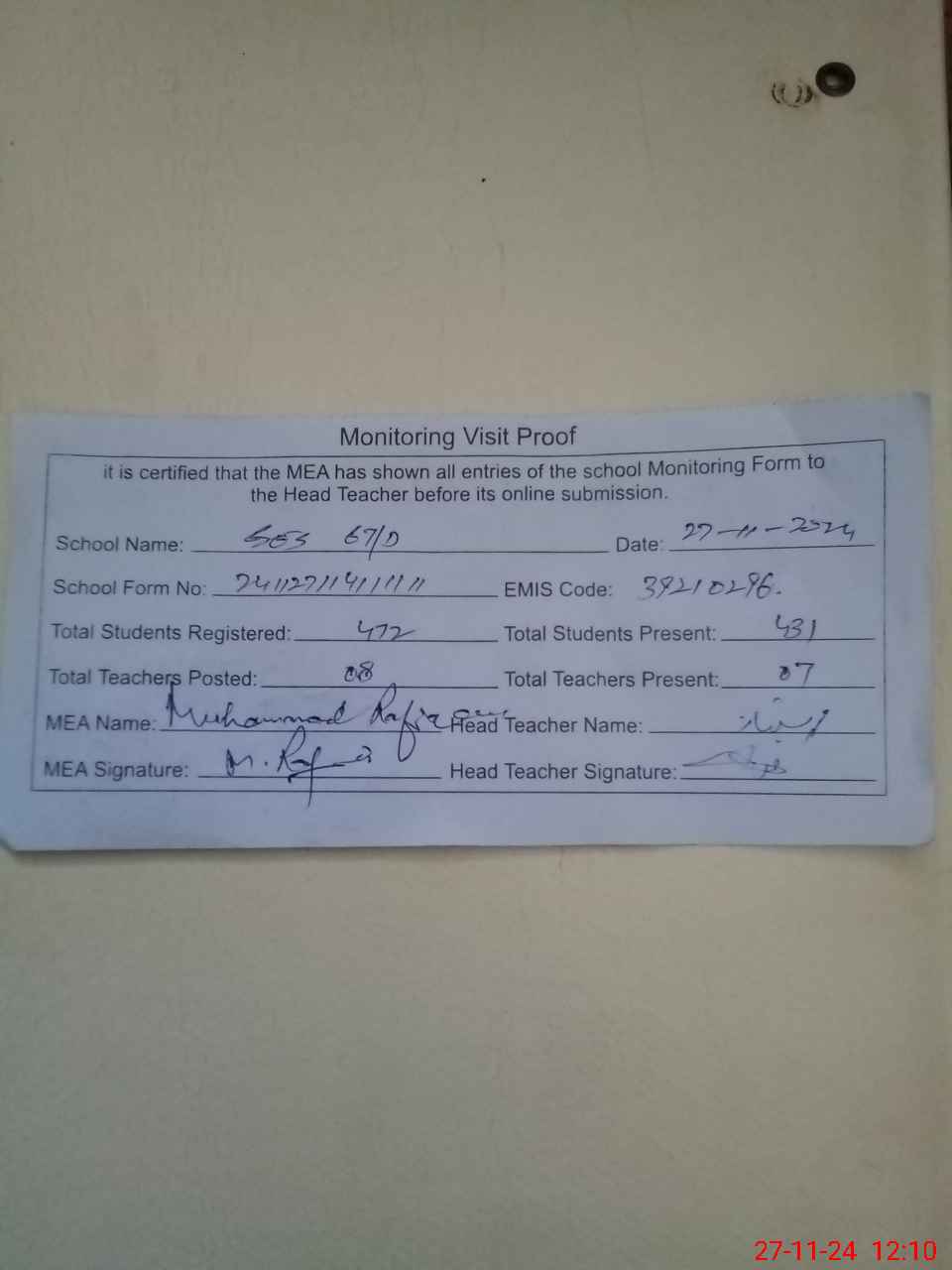 | Attendance Register | Head Teacher | MEA with School | Visit Proof |