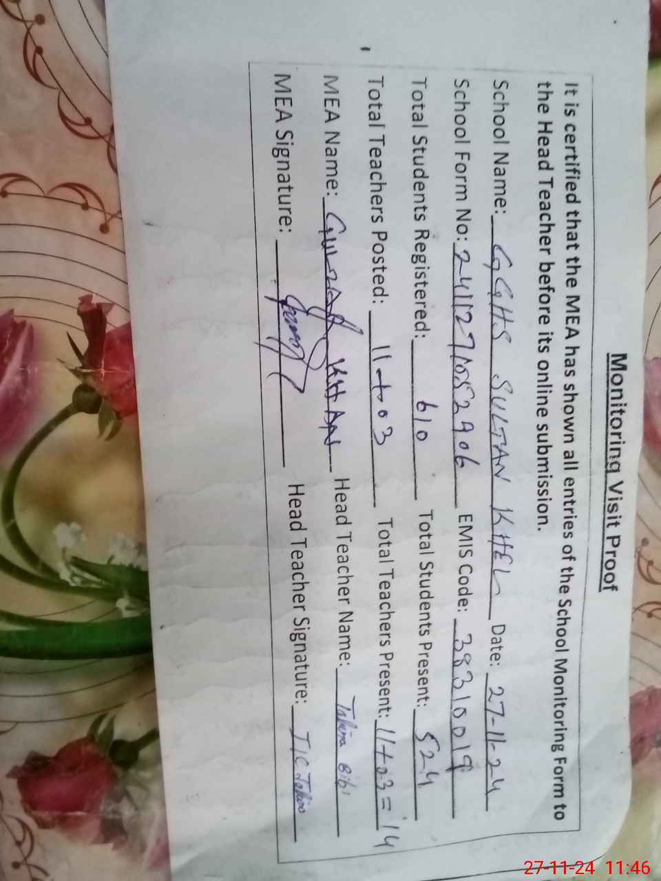 | EMIS Code: 38310019 | Name of School: GGHS SULTAN KHEL | |||