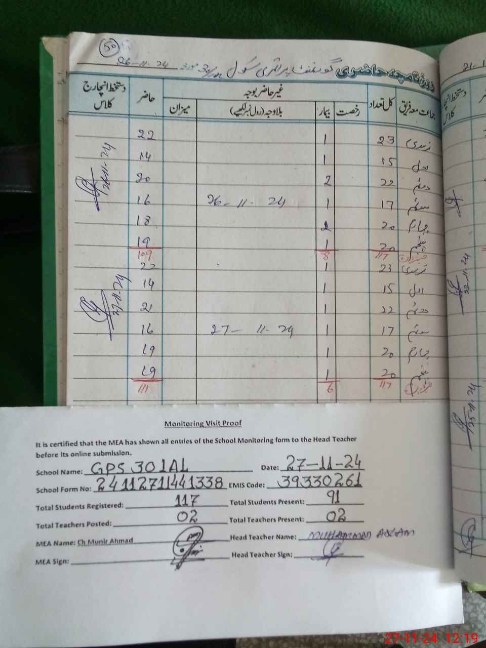 | Attendance Register | Head Teacher | MEA with School | Visit Proof |