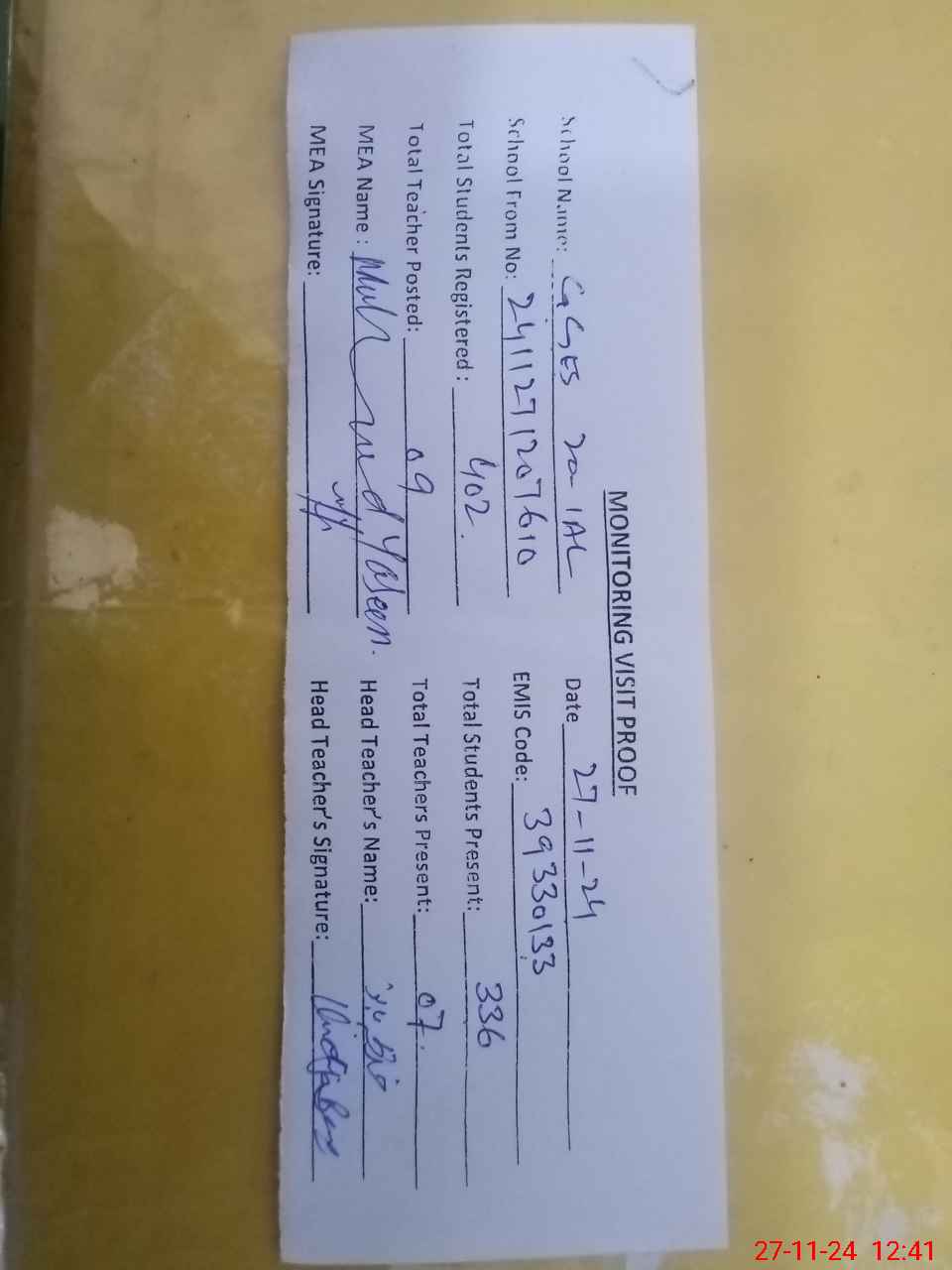 | Attendance Register | Head Teacher | MEA with School | Visit Proof |