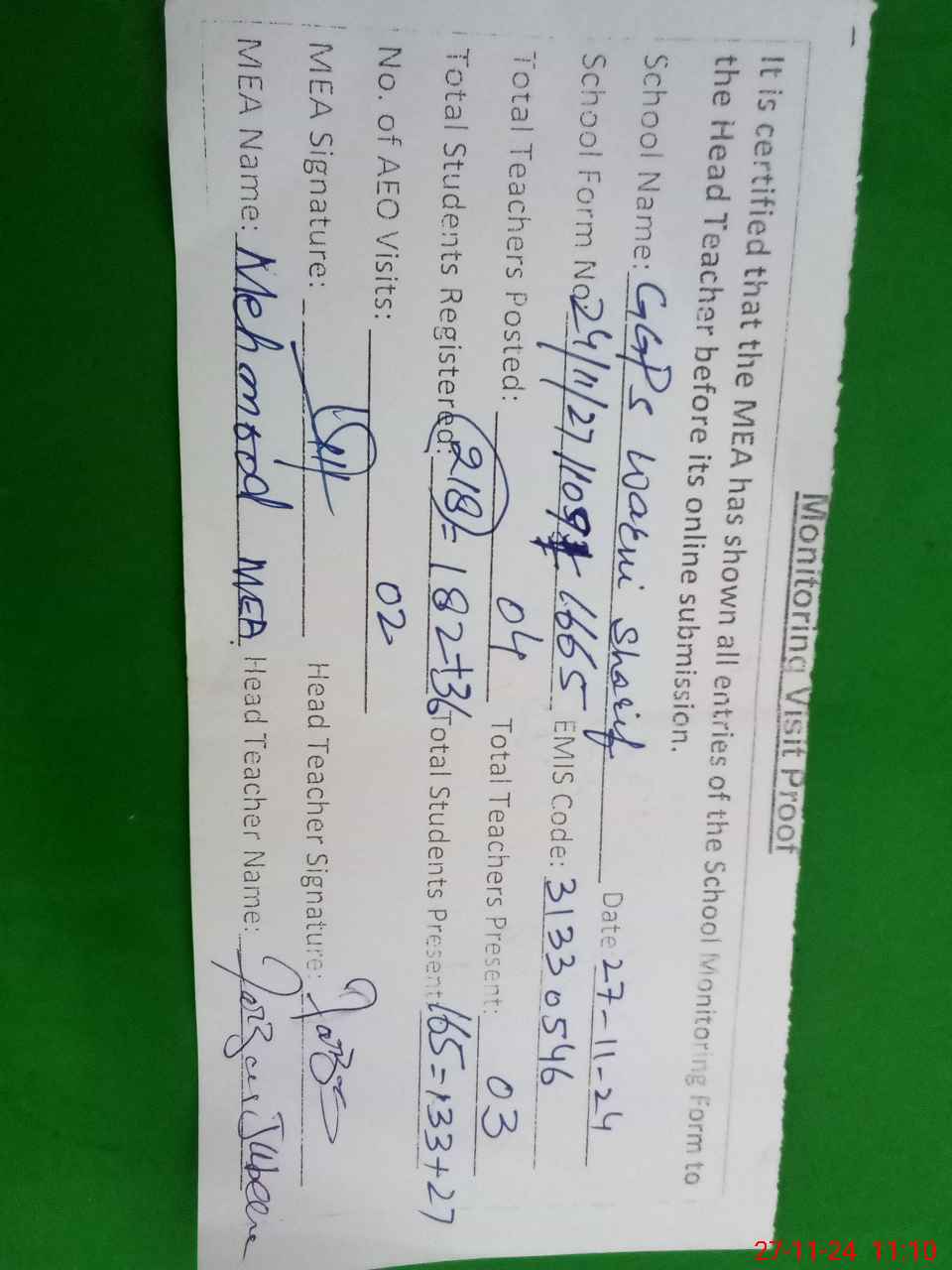 | Attendance Register | Head Teacher | MEA with School | Visit Proof |