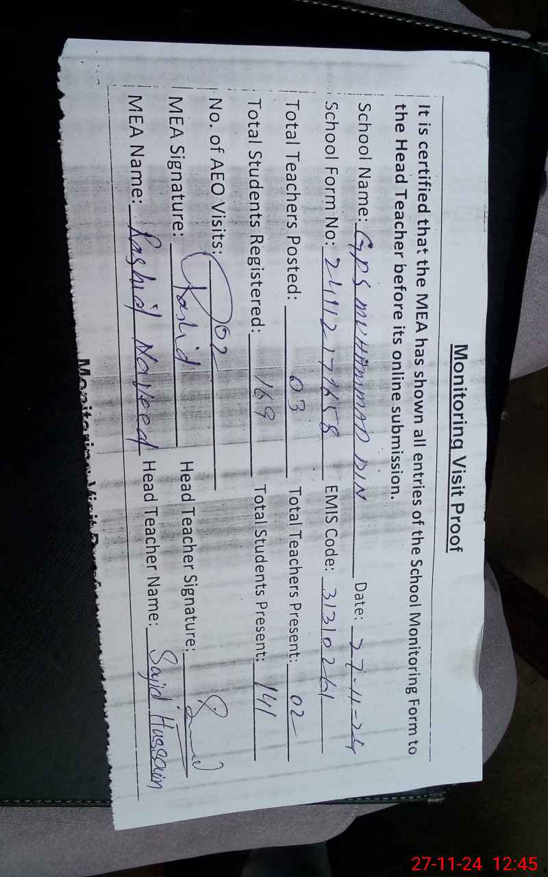 | EMIS Code: 31310261 | Name of School: GPS MUHAMMAD DIN | |||