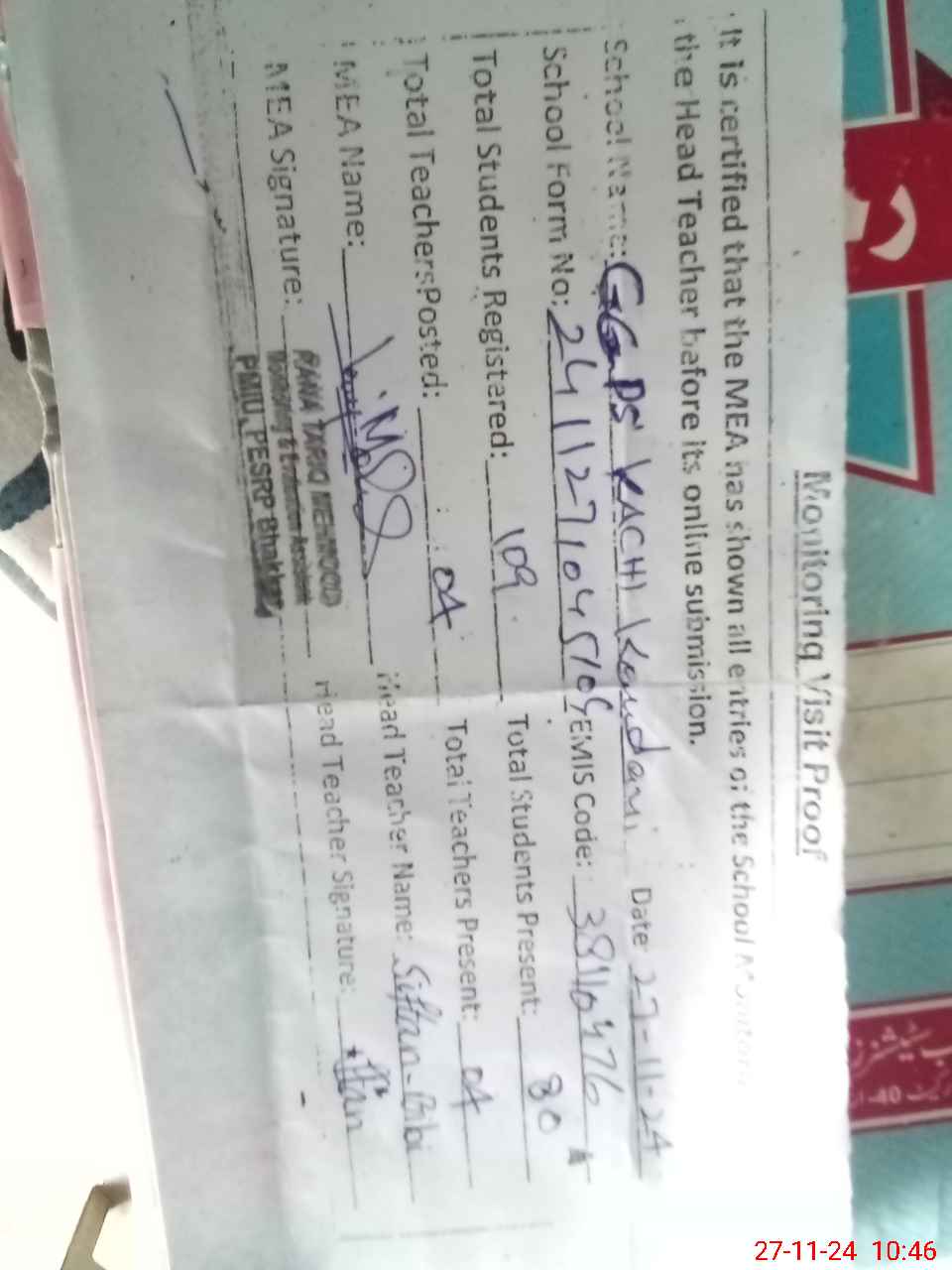 | Attendance Register | Head Teacher | MEA with School | Visit Proof |
