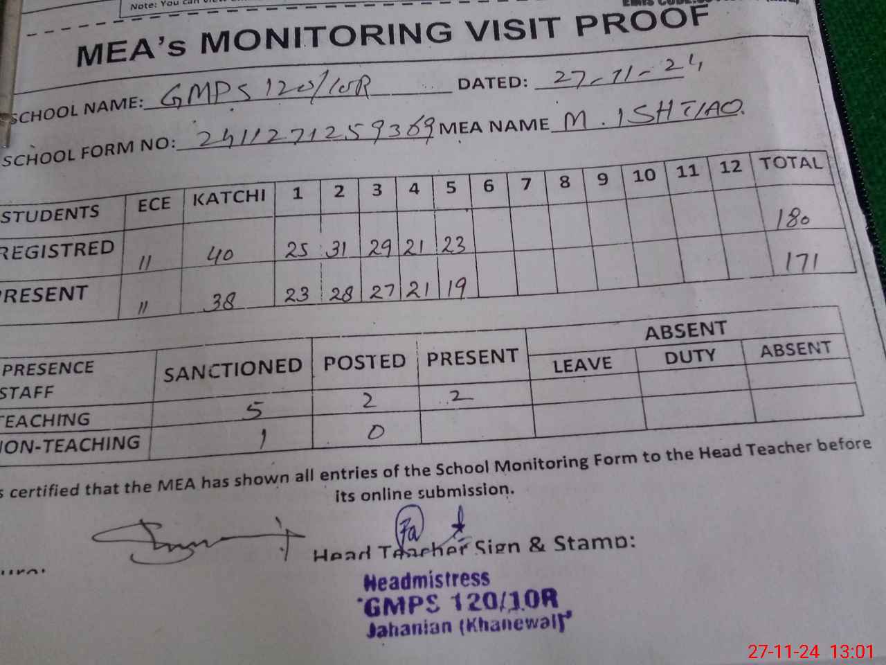 | Attendance Register | Head Teacher | MEA with School | Visit Proof |