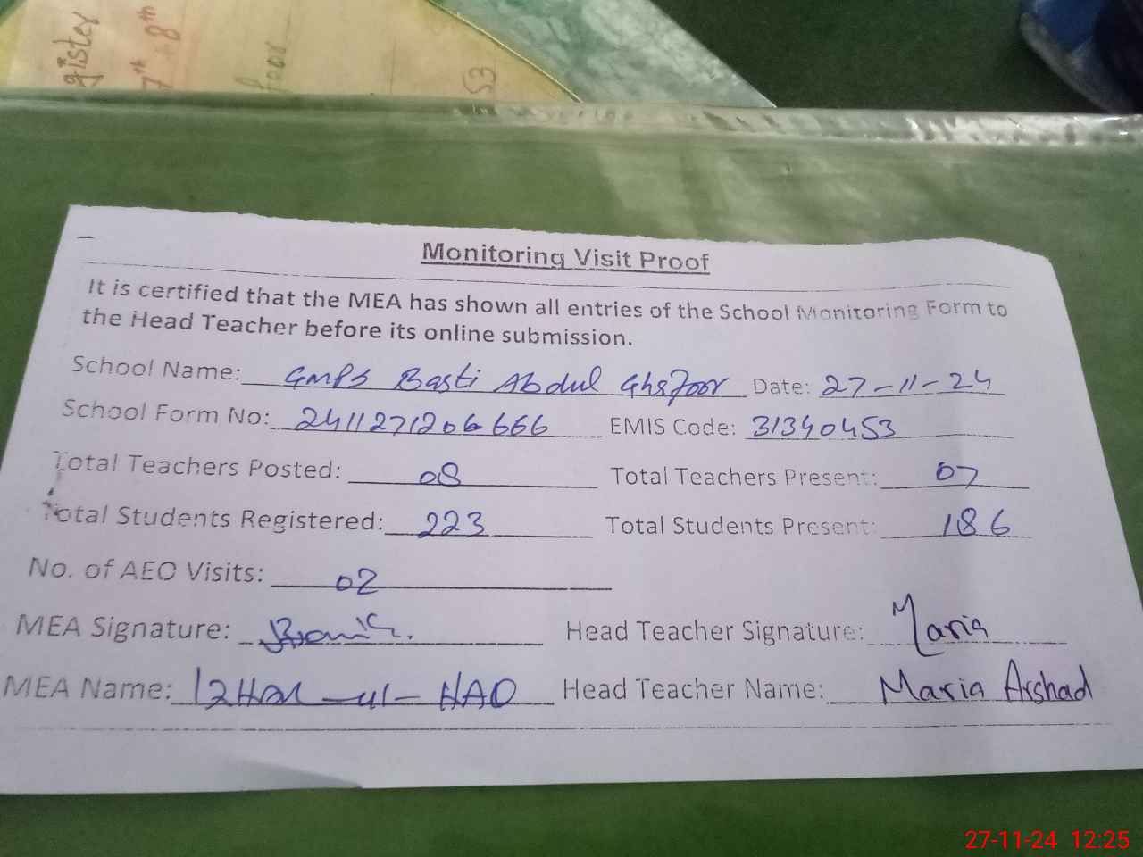 | Attendance Register | Head Teacher | MEA with School | Visit Proof |