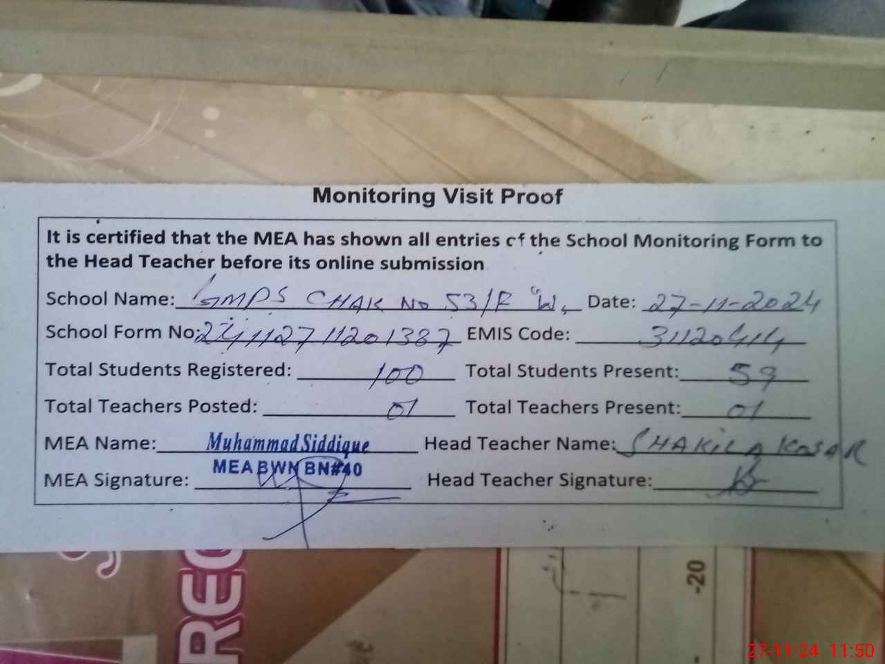 | Attendance Register | Head Teacher | MEA with School | Visit Proof |