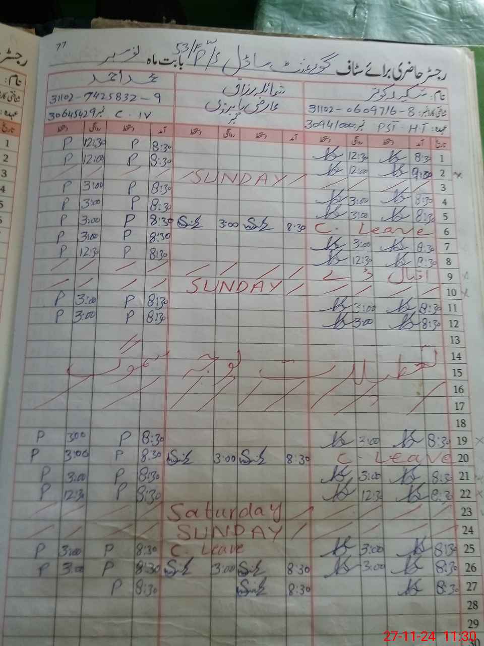 | CNIC | Full Name | Designation | R/C | Absence During Last Calender Month |