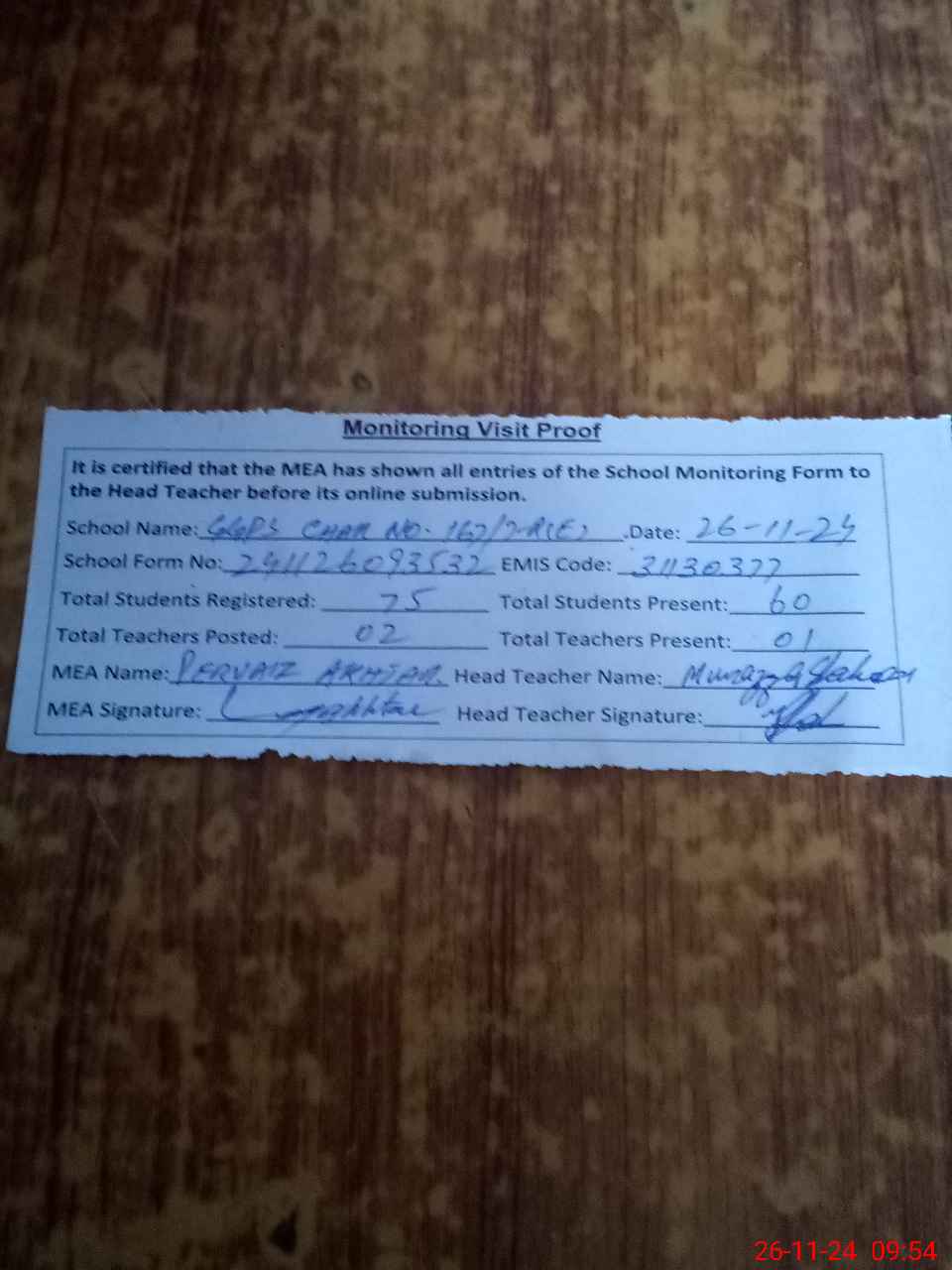 | EMIS Code: 31130377 | Name of School: GGPS CHAK NO 167/7-R E | |||