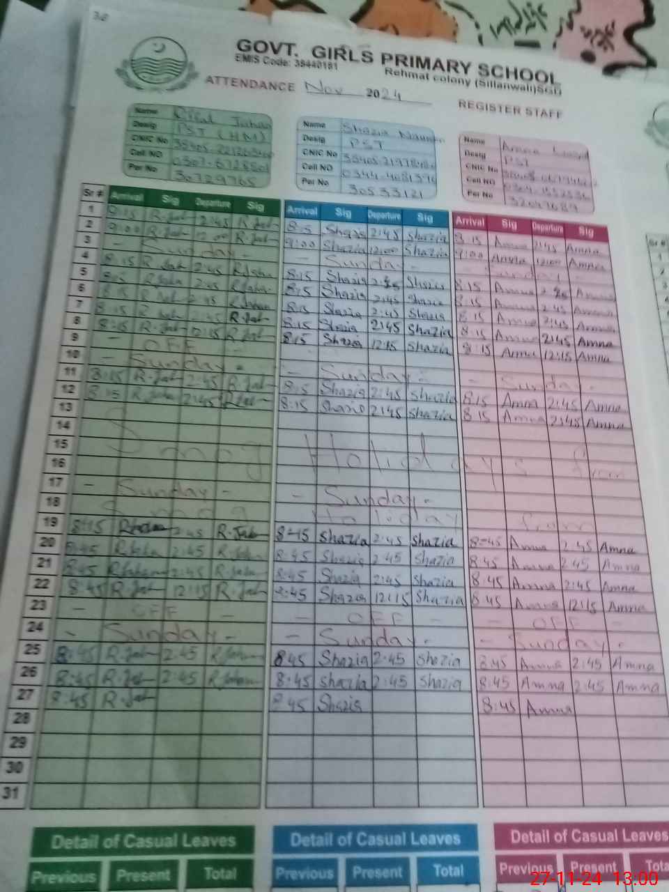 | CNIC | Full Name | Designation | R/C | Absence During Last Calender Month |
