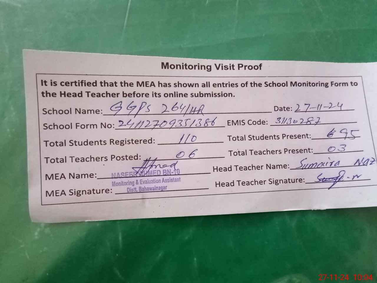 | Monitoring Date: 27-11-2024 | Start Time: 27-11-2024 09:35 AM | End Time: 27-11-2024 10:04 AM | Name of MEA: NA**** AH**** BN**** | |