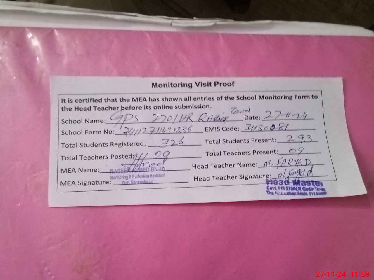 | EMIS Code: 31130081 | Name of School: GPS CHAK NO.270/HR QADIR TOWN | |||