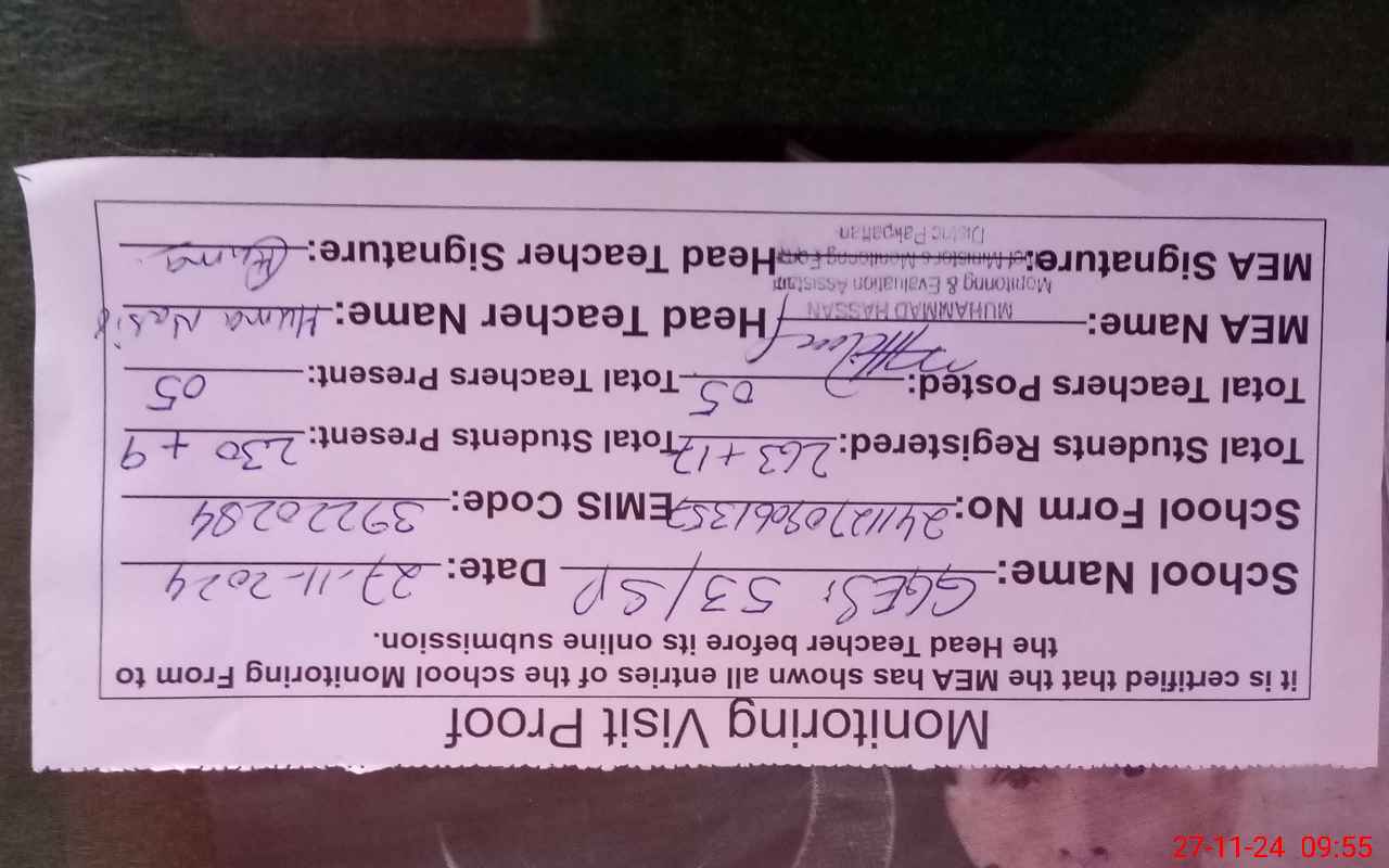 | EMIS Code: 39220284 | Name of School: GGES 53 SP POST OFFICE JEVEN SHAH | |||