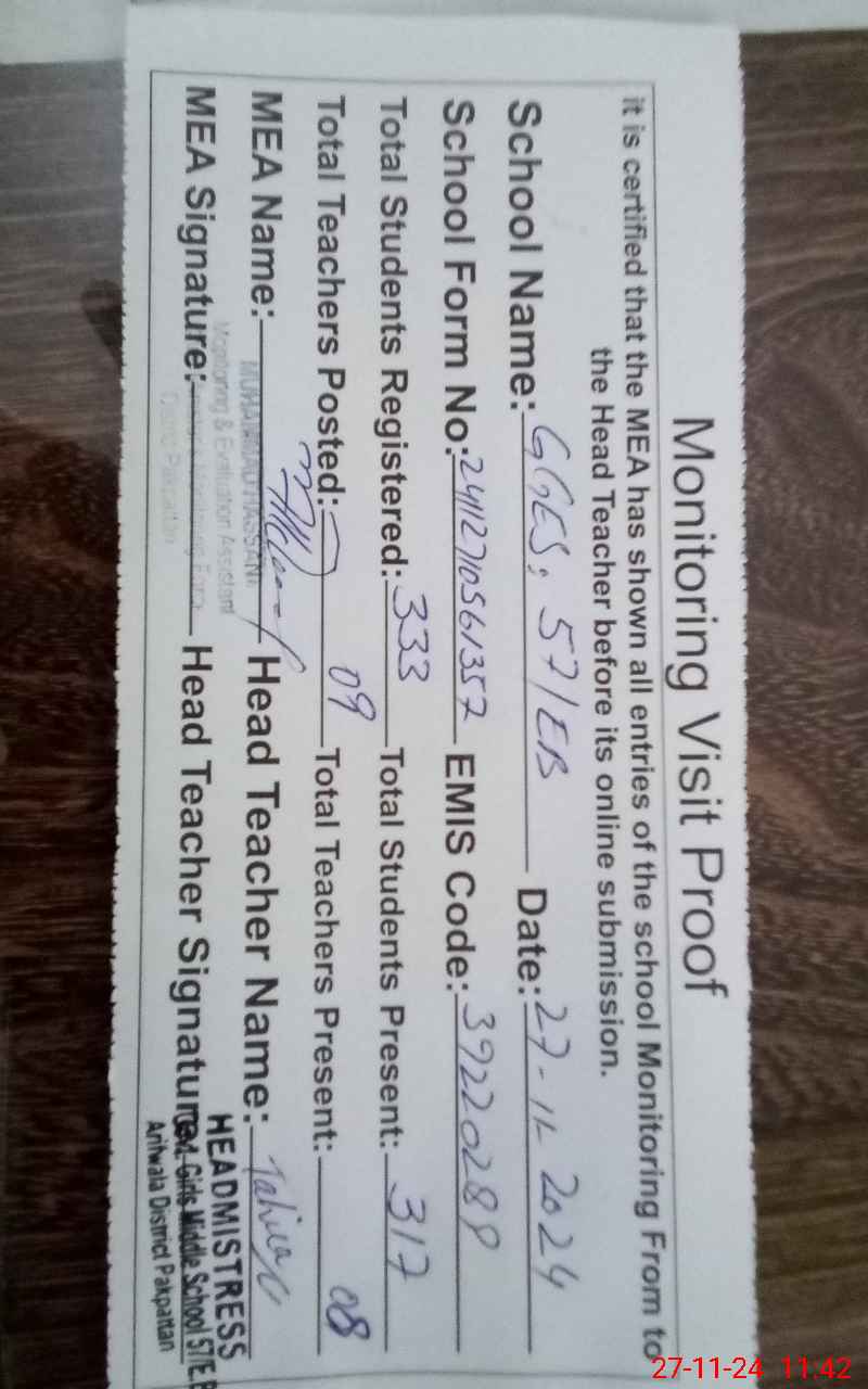 | EMIS Code: 39220289 | Name of School: GGES 57 EB | |||
