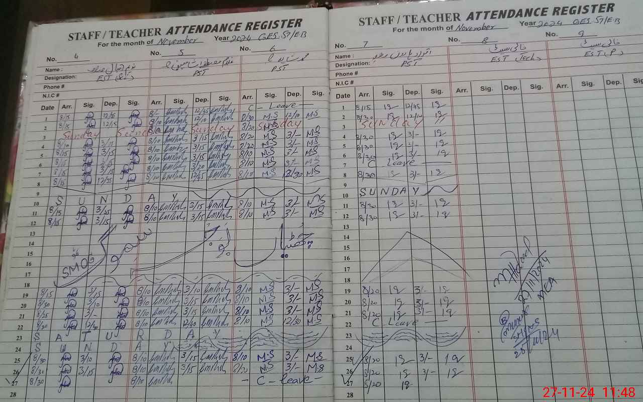 | CNIC | Full Name | Designation | R/C | Absence During Last Calender Month |