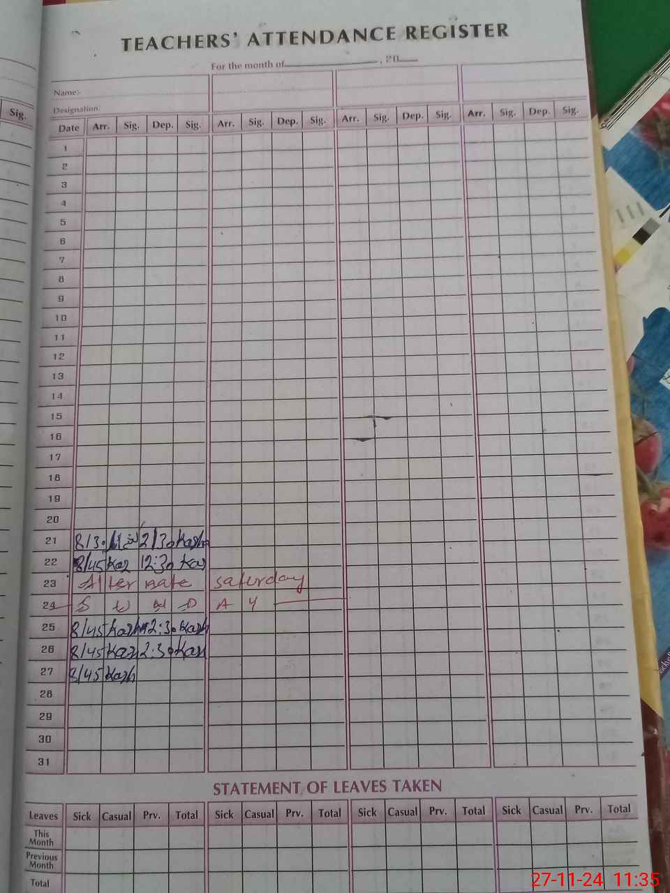 | Leave | Duty | Absent | Maternity | Medical | Ex- Pak |