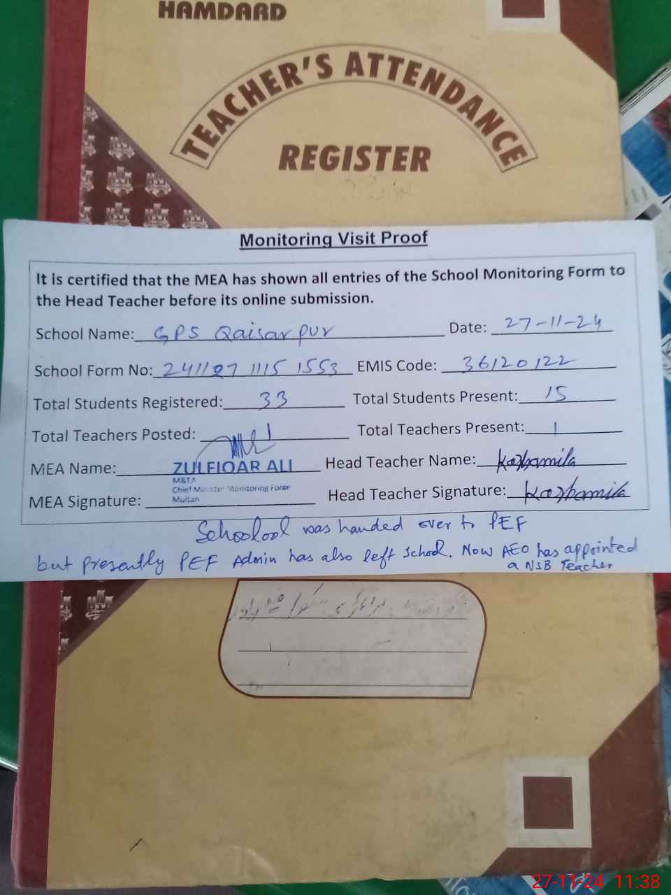 | Attendance Register | Head Teacher | MEA with School | Visit Proof |