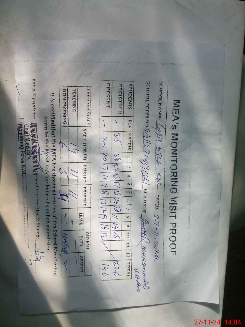 | Attendance Register | Head Teacher | MEA with School | Visit Proof |