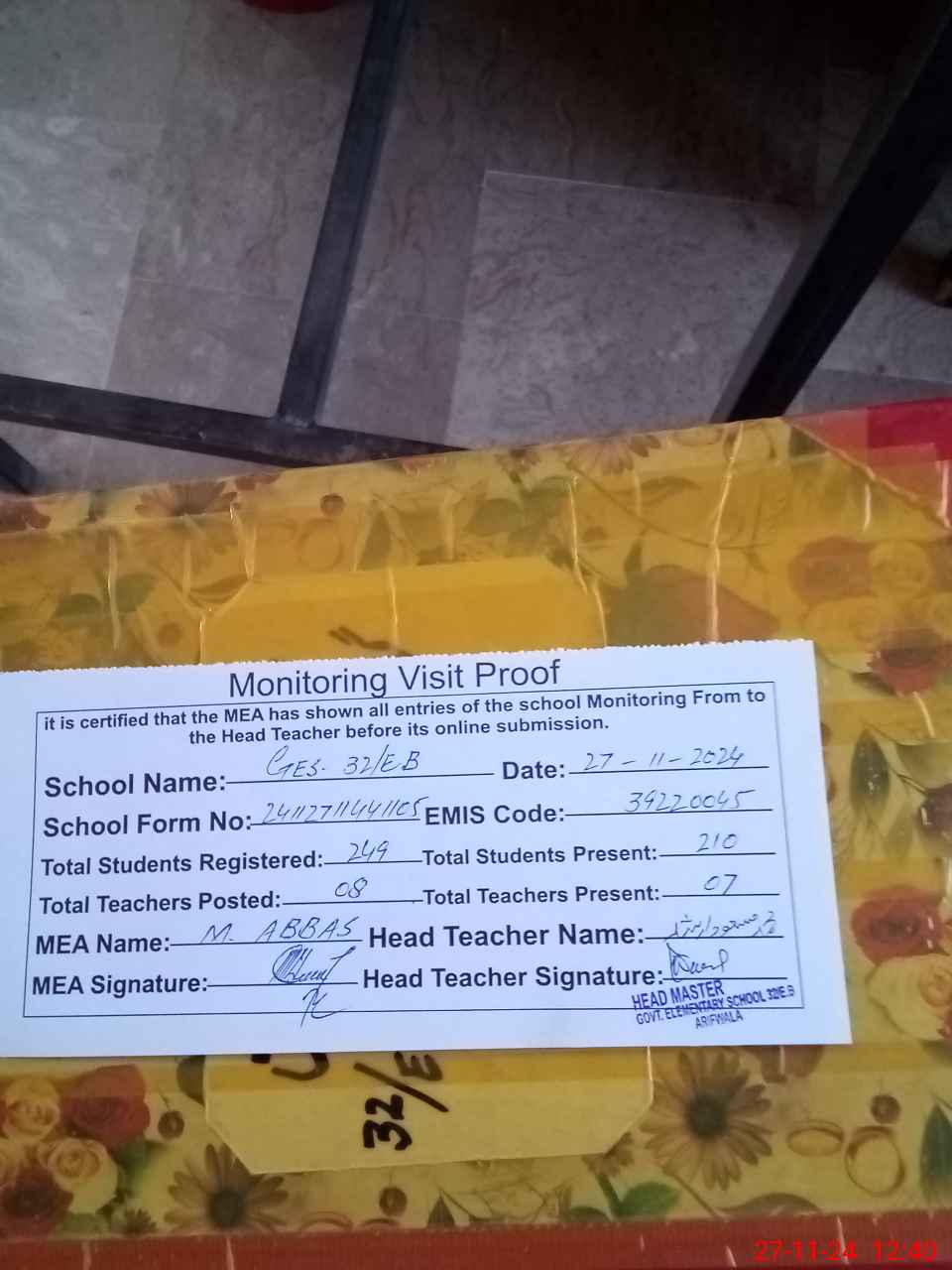 | Attendance Register | Head Teacher | MEA with School | Visit Proof |