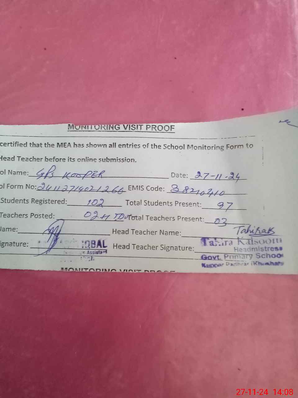 | Attendance Register | Head Teacher | MEA with School | Visit Proof |