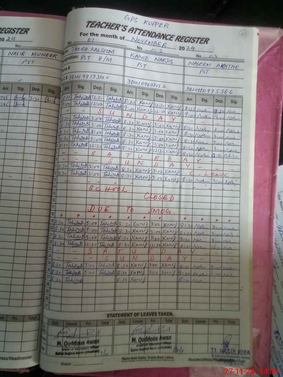 | CNIC | Full Name | Designation | R/C | Absence During Last Calender Month |