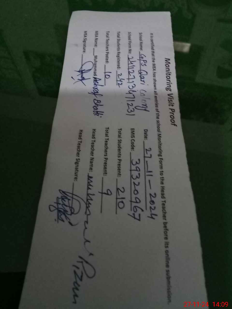 | EMIS Code: 39320967 | Name of School: GPS MC QARI COLONY | |||