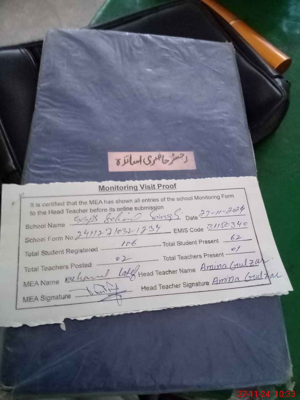 | Attendance Register | Head Teacher | MEA with School | Visit Proof |