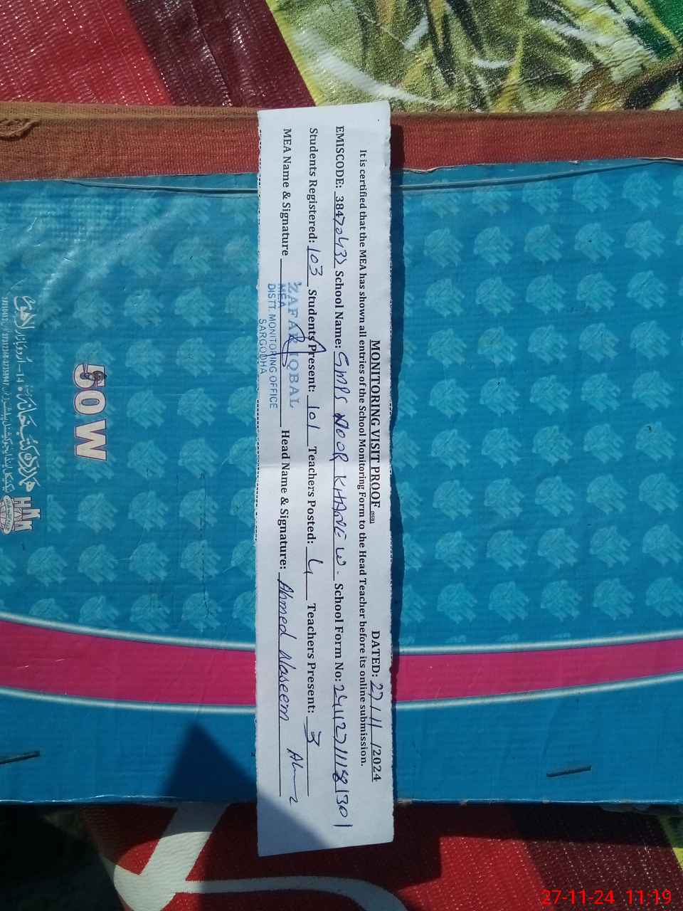 | Attendance Register | Head Teacher | MEA with School | Visit Proof |