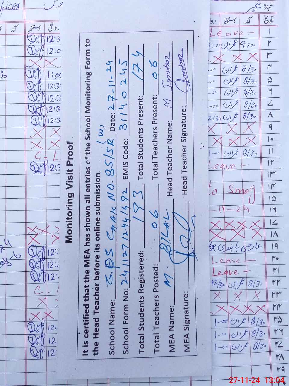 | Attendance Register | Head Teacher | MEA with School | Visit Proof |
