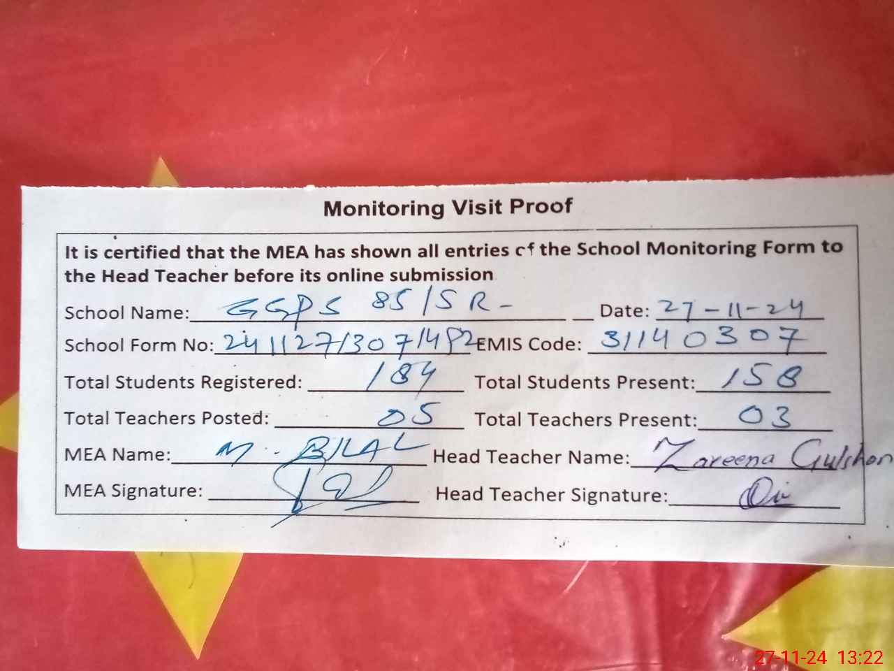 | Attendance Register | Head Teacher | MEA with School | Visit Proof |