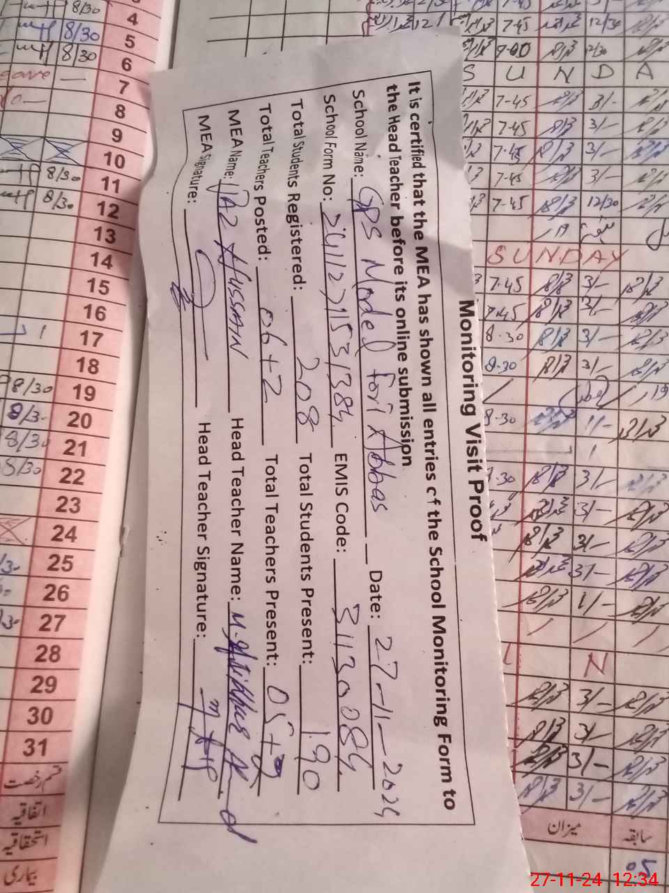 | Attendance Register | Head Teacher | MEA with School | Visit Proof |