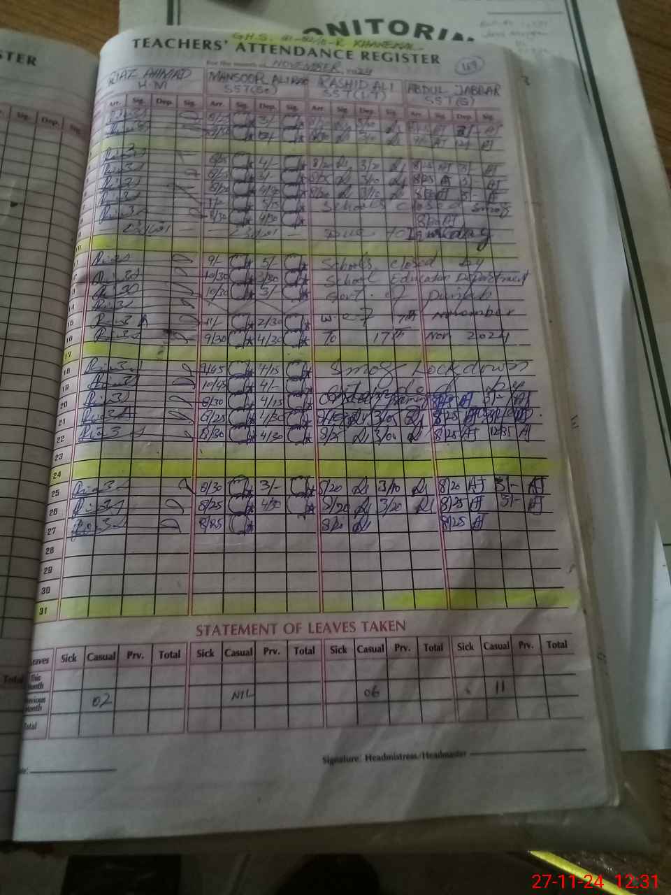 | Monitoring Date: 27-11-2024 | Start Time: 27-11-2024 12:25 PM | End Time: 27-11-2024 01:27 PM | Name of MEA: MU**** SA**** AK**** 13**** | |