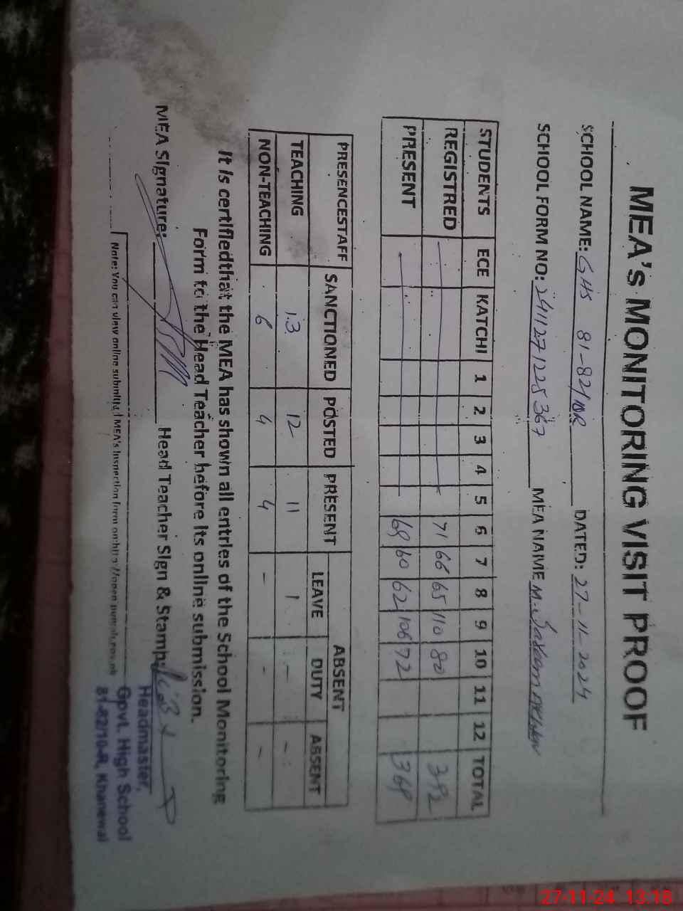 | Attendance Register | Head Teacher | MEA with School | Visit Proof |