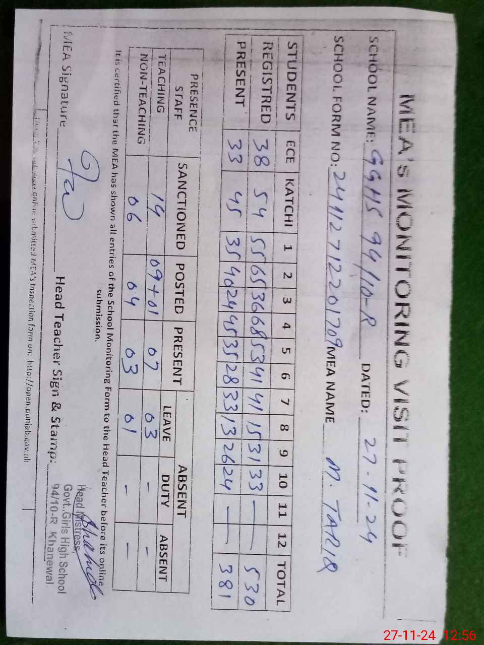 | Attendance Register | Head Teacher | MEA with School | Visit Proof |