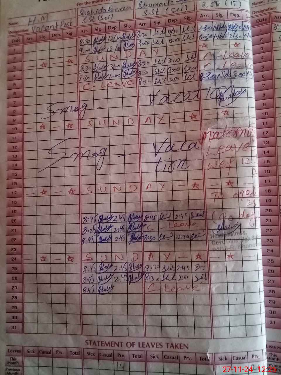 | Leave | Duty | Absent | Maternity | Medical | Ex- Pak |