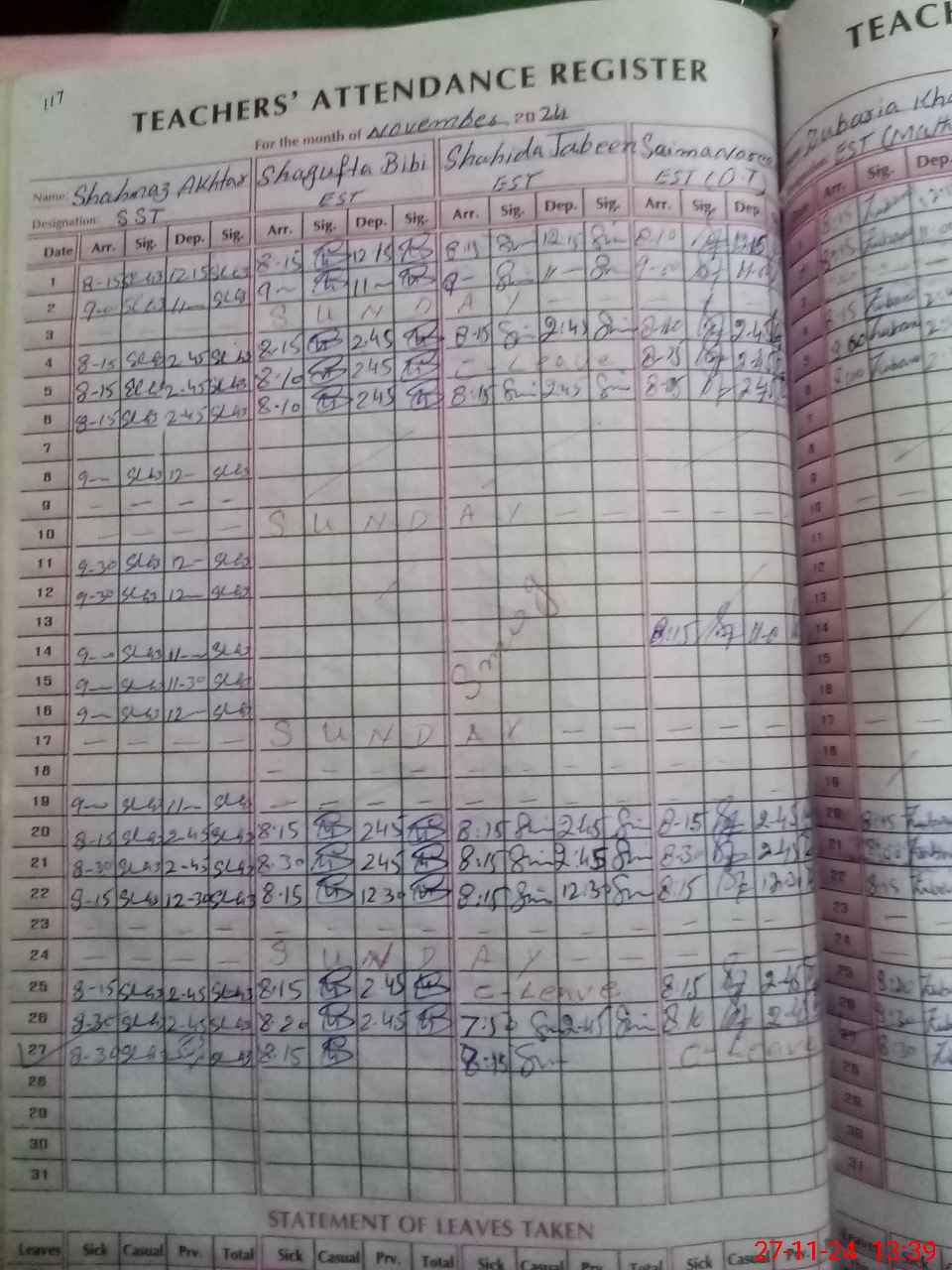 | CNIC | Full Name | Designation | R/C | Absence During Last Calender Month |