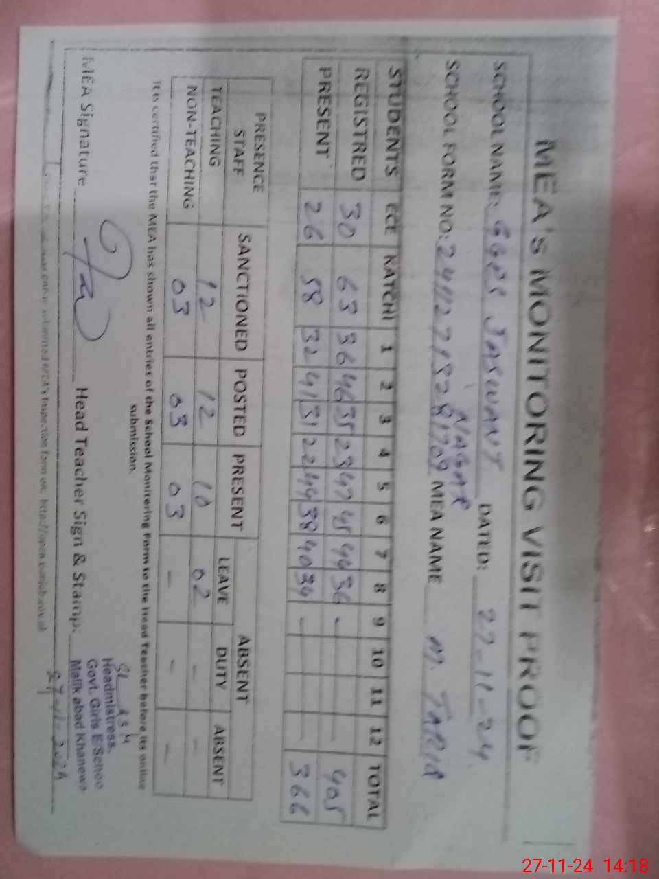 | Attendance Register | Head Teacher | MEA with School | Visit Proof |