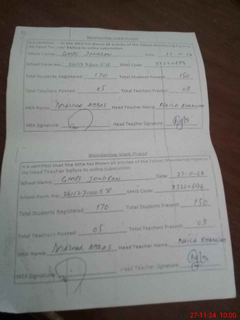 | Attendance Register | Head Teacher | MEA with School | Visit Proof |